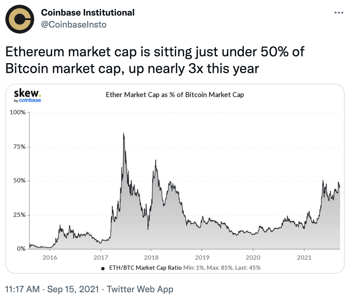 SponsoredEl ascenso en la inversión en Ethereum ha creado que la capitalización de mercado de Ethereum ascienda hasta el 50% de la capitalización de mercado de Bitcoin, el dominio de Bitcoin está en descenso reforzando las altcoins.