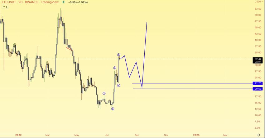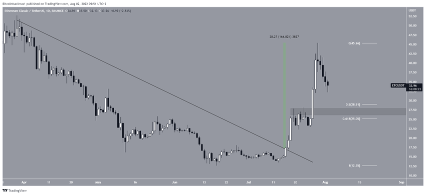 El gráfico diario muestra que ETC rompió una línea de resistencia descendente a corto plazo el 15 de julio. Posteriormente, procedió a aumentar en un 165% en un período de 14 días. Esto llevó a un máximo de 45,36 dólares el 29 de julio.