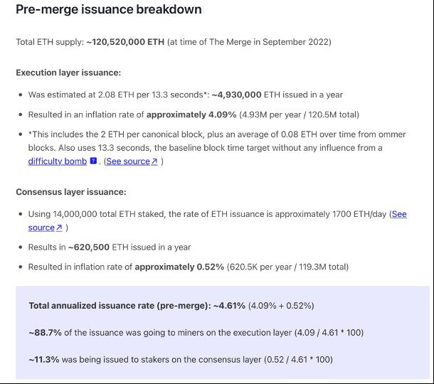Antes de The Merge, la cantidad de ETH emitidos por día se calculaba de la siguiente manera: (1) Recompensas de bloque para mineros + (2) Recompensas de staker de PoS – (3) Tarifas de ETH quemadas por EIP-1559.