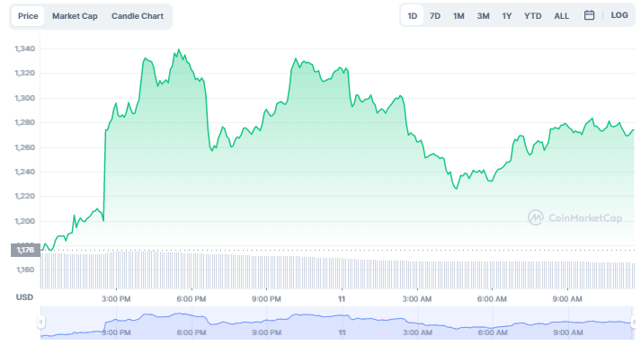 El token nativo de Ethereum, ETH, sufrió otra corrección, que se vio exacerbada por el colapso del exchange de cifrado FTX. A pesar de un ligero repunte, el precio de ETH actualmente ronda los 1,270 dólares, un 74% menos que su máximo histórico.