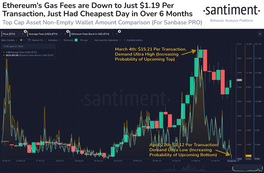 La tarifa de transacción promedio de ETH es de 1,12 dólar, marcando su costo promedio diario más bajo desde el 18 de octubre de 2023. La actualización Dencun y la calma en el mercado de criptomonedas en general han dado como resultado una menor actividad on-chain, lo que ha impulsado las tarifas de gas de la criptomoneda a la baja.
