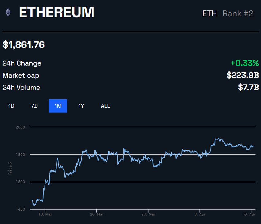 Los precios de Ethereum se han mantenido estables durante las últimas 24 horas. Como resultado, el activo se negociaba por 1,859 dólares al momento de escribir este artículo.