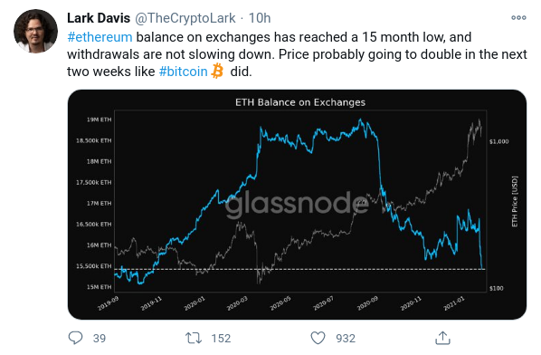 Lark Davis, observador de la industria, notó que el Ethereum mantenido en los exchanges ha alcanzado un mínimo de quince meses, lo que podría conducir a más aumentos de precios:
