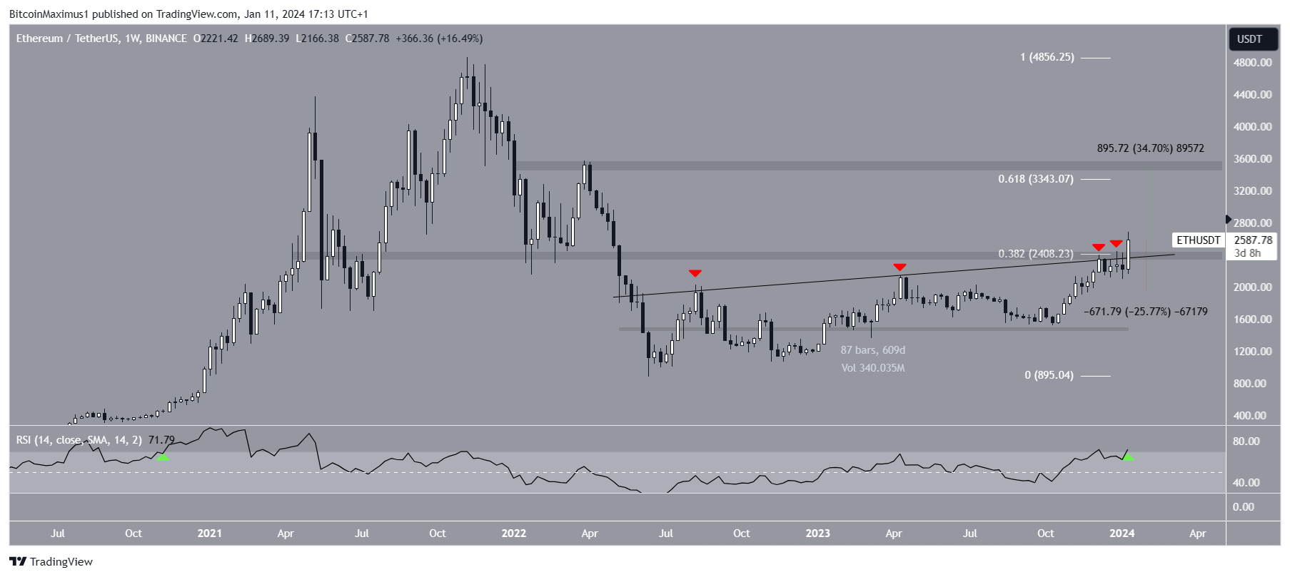 El análisis técnico del marco de tiempo semanal muestra que el precio de ETH ha aumentado en una trayectoria gradual desde mayo de 2022.