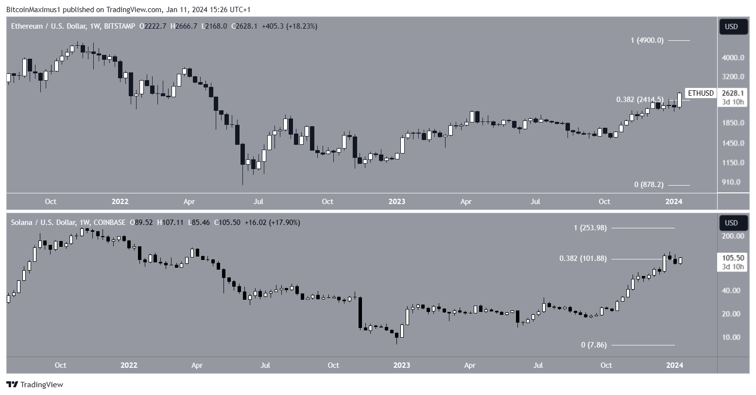 Si nos fijamos en los niveles de Fibonacci, SOL y ETH han retrocedido de forma similar. Ambos están cerca de sus niveles de resistencia de Fib 0,382.