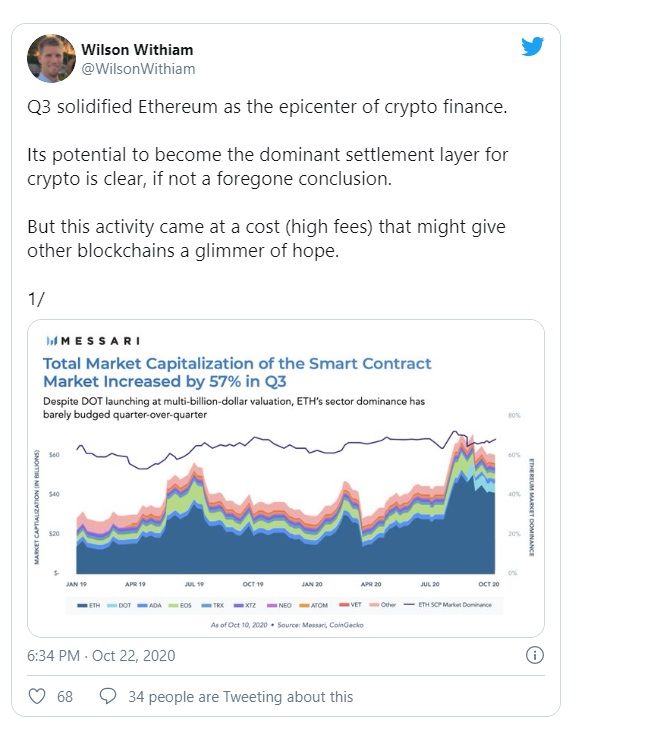 Según el investigador de Messari, Wilson Withiam, la capitalización de mercado total del mercado de contratos inteligentes aumentó en un 57% en el tercer trimestre.