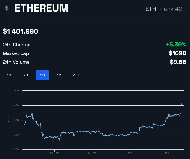 Ethereum ha superado a Bitcoin el día de hoy, registrando una ganancia del 6.7% en las últimas 12 horas. El movimiento llevó los precios de ETH a un máximo de nueve semanas de 1,410 dólares durante la sesión asiática de trading del jueves por la mañana.