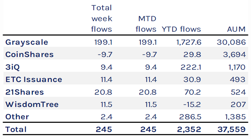 Las mayores entradas provienen de Grayscale Investments, que es el más conocido de los proveedores institucionales de cripto. La empresa representó casi 200 millones de dólares en entradas semanales, que es aproximadamente el 80% de todos los principales proveedores.