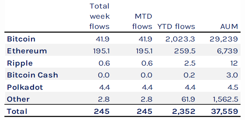 Según los datos de CoinShares, Ethereum generó 195 millones de dólares en entradas semanales. El informe encontró que los inversores están «excepcionalmente concentrados» en el activo.