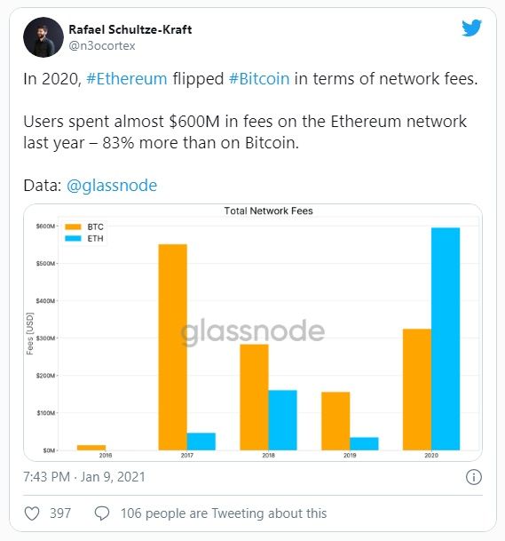“En 2020, Ethereum superó a Bitcoin en términos de tarifas de red. Los usuarios gastaron casi 600 millones de dólares en tarifas en la red Ethereum el año pasado, un 83% más que en Bitcoin”.