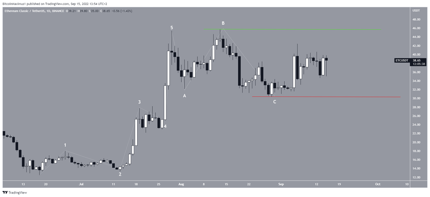 El movimiento ETC es muy similar al de BNB. El precio parece haber completado un movimiento ascendente de cinco ondas y luego una estructura correctiva A-B-C.