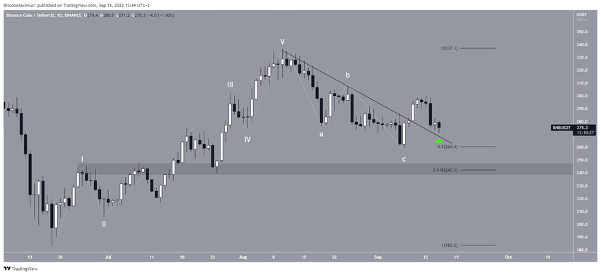 Midiendo desde los mínimos de junio, BNB parece haber completado un movimiento ascendente de cinco ondas que condujo al máximo de 337 dólares el 10 de agosto. Desde entonces, cayó debajo de una línea de resistencia descendente en lo que parece ser una estructura correctiva A-B-C.