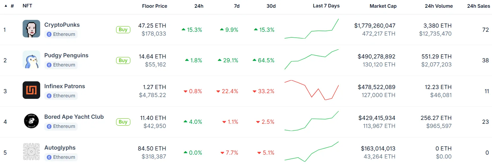 Los proyectos basados en Ethereum representaron más de la mitad de ese total, registrando 75 millones de dólares en volumen y liderando la recuperación del mercado NFT en general. Esto representa un aumento del 300% respecto a solo dos semanas antes, cuando los NFTs de Ethereum vieron solo 18,3 millones de dólares en volumen de trading.
