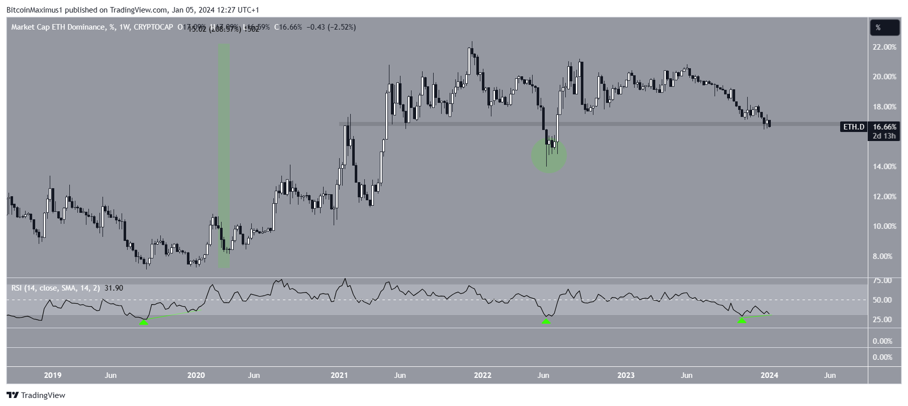 El dominio de Ethereum está por debajo de un nivel de soporte a largo plazo en el 17%. Esto es crítico ya que actuó como resistencia y soporte desde 2021, excepto por una desviación en junio (círculo verde).