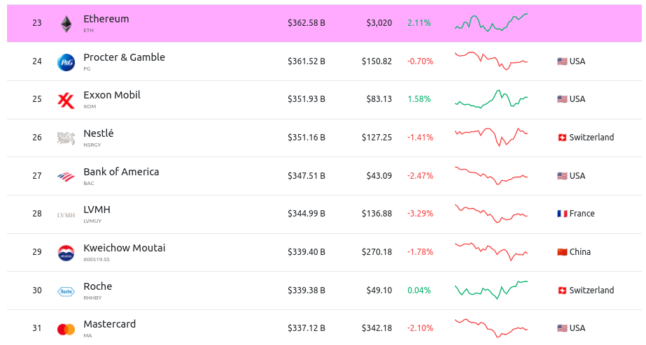 Ethereum (ETH) se encuentra nuevamente sobre la marca de los 3,000 dólares, a tiempo que ha logrado superar a empresas como P&G, Nestlé y Mastercard en términos de capitalización de mercado.