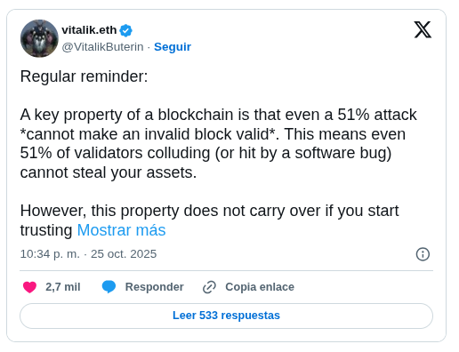El 26 de octubre, Buterin explicó que incluso un ataque del 51% no puede validar un bloque inválido. Esto significa que incluso si una mayoría de validadores colude o experimenta un error de software, no pueden apoderarse de los fondos de los usuarios o falsificar transacciones.