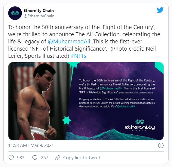 Ethernity Chain está aprovechando el boom para lanzar su propio NFT. La plataforma, que es famosa por producir NFT auténticos, anunció a través de Twitter que lanzará una colección en honor a la leyenda del boxeo Muhammad Ali.