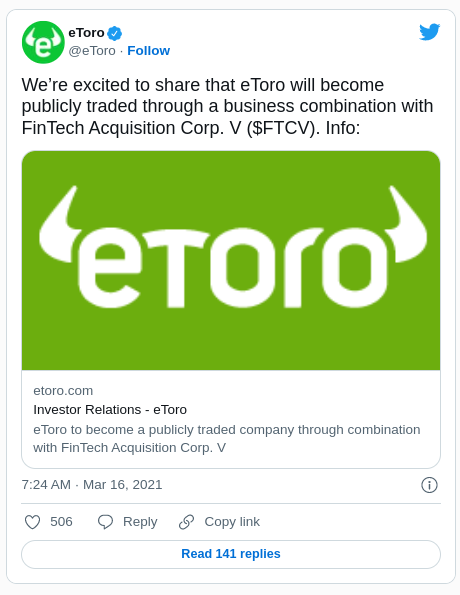 eToro y FinTech Acquisition Corp V acordaron mutuamente rescindir un acuerdo de fusión anunciado por primera vez en marzo, poniendo fin a los planes de cotización pública de eToro en Nasdaq.
