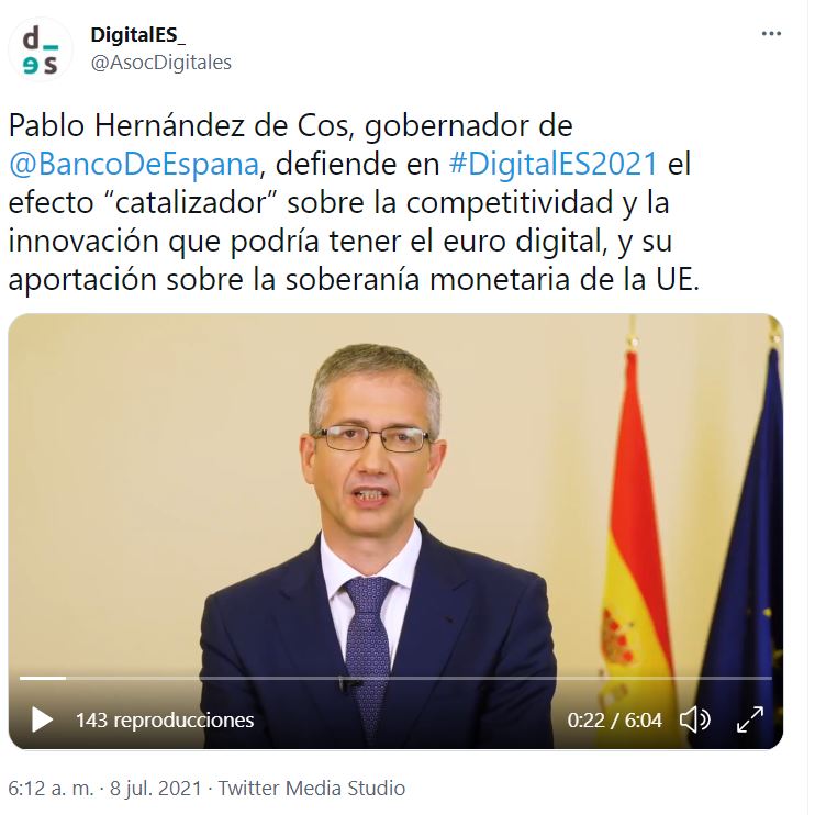 Durante su participación en el DigitalES Summit 2021, Hernández de Cos recordó que hay proyectos de moneda digital mucho más avanzados en otros países y argumentó que Suecia ya hay un programa piloto, mientras que el Banco de Inglaterra o la Reserva Federal de Estados Unidos ya trabajan en proyectos similares.