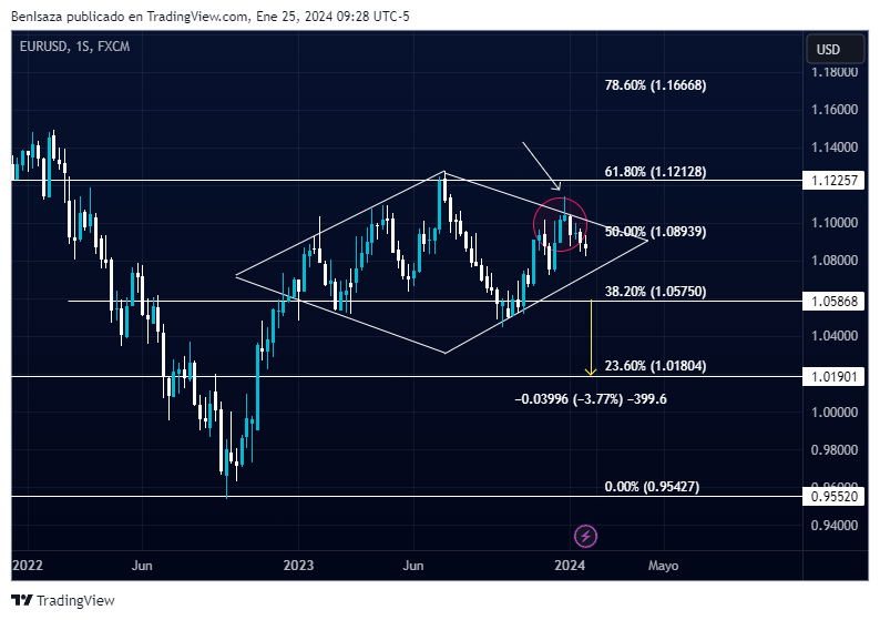 El euro no logra recuperar la barrera de los 1.089 dólares y retrocede 2.83% desde los máximos alcanzados en diciembre de 2023.