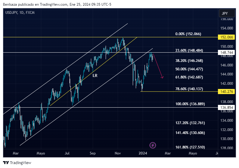 Creando un nuevo máximo decreciente sobre la barrera de los 148 yenes, el dólar proyecta una continuidad descendente con objetivo los 142 yenes que corresponden al 61.8 de Fibonacci en el gráfico.