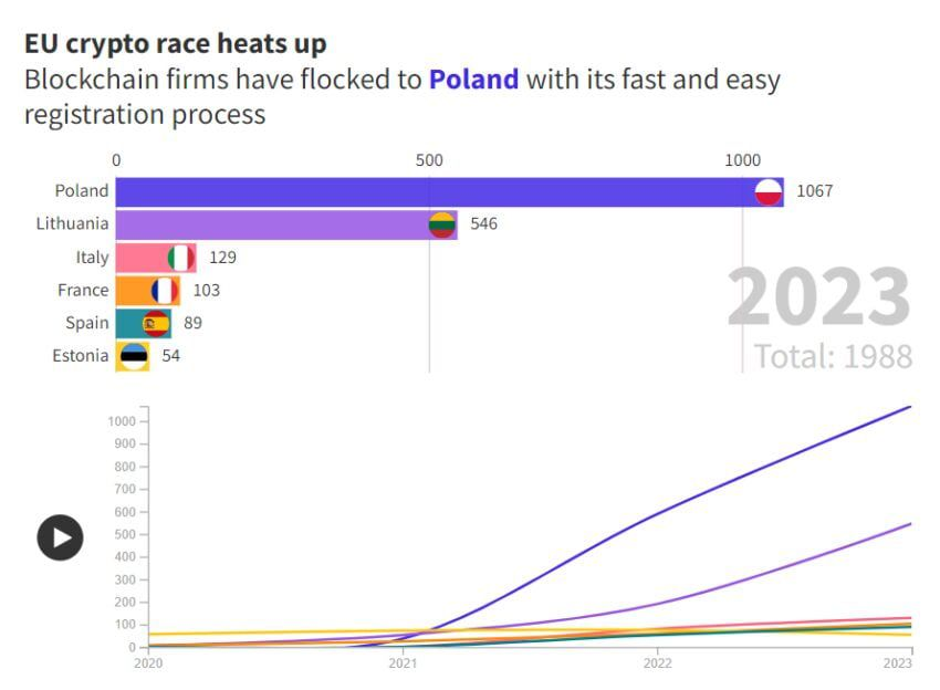 Polonia se ha convertido en el líder en registro de VASP en Europa, caracterizándose por un proceso de concesión de licencias rápido y relativamente sencillo. Durante el año, el país registró 1,067 empresas como proveedores de servicios cripto.