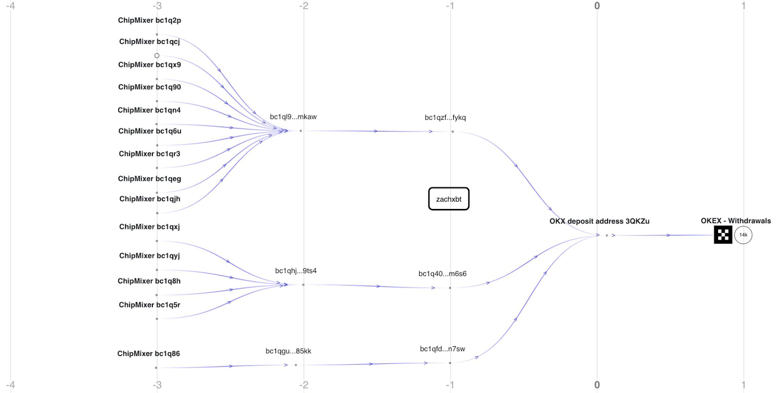 Según un tweet antiguo del detective en cadena ZachXBT, los hackers de FTX transfirieron fondos al exchange OKX a través de ChipMixer. Un mezclador cripto es un servicio externo que puede ofuscar los datos que vinculan una dirección a las transferencias cripto.