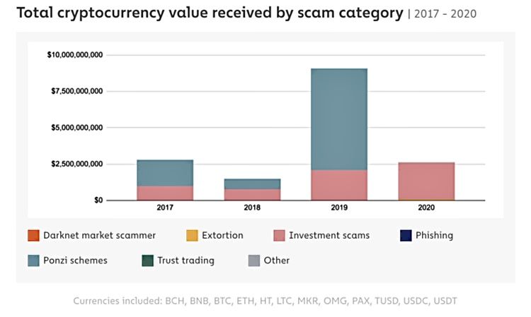 Según el Chainalysis Crime Report 2020, los esquemas Ponzi representaron el 92% de los ingresos totales por estafas en 2019, lo que significa que las víctimas perdieron 3.900 millones de dólares solo en esquemas Ponzi. Tenga en cuenta que la estafa Plus Token sigue siendo uno de los mayores esquemas Ponzi en la historia de los activos digitales.
