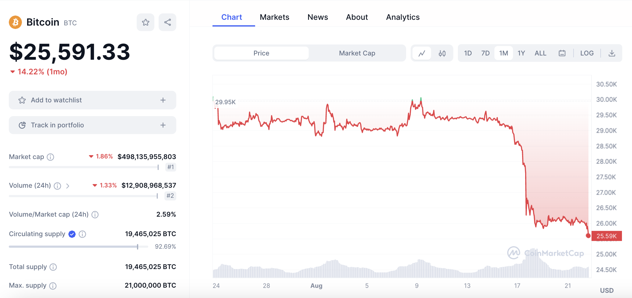 Actualmente, el precio de Bitcoin continúa a la baja en la última semana, al pasar de 29,161 a 25,830 dólares. Incluso, el pasado 17 de agosto, la criptomoneda cayó 7% en solo 20 minutos, pasando de 28,593 a 25,409 dólares. Ethereum también ha caído 13,55% en el último mes, al pasar de 1,893 a 1,632 dólares, y Solana ha retrocedido 20% en 30 días, al pasar de 25,31 a 20,20 dólares.