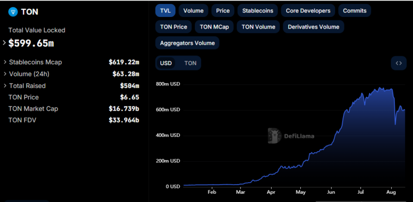 SponsoredEste anuncio llega durante un período de crecimiento explosivo para el ecosistema TON. Recientemente, superó a Ethereum en usuarios activos diarios y vio un aumento de 1,069 mil millones de dólares en activos totales entre enero y julio. Según DefiLlama, el valor total bloqueado (TVL) de TON ha aumentado un 4,226% en 2024.