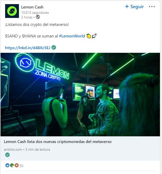 Al igual que otros exchanges de la región como Bitso, la plataforma argentina, Lemon Cash, anunció que también se sube al tren del metaverso e integra los tokens de Decentraland y The Sandbox, a su portafolio de criptomonedas.