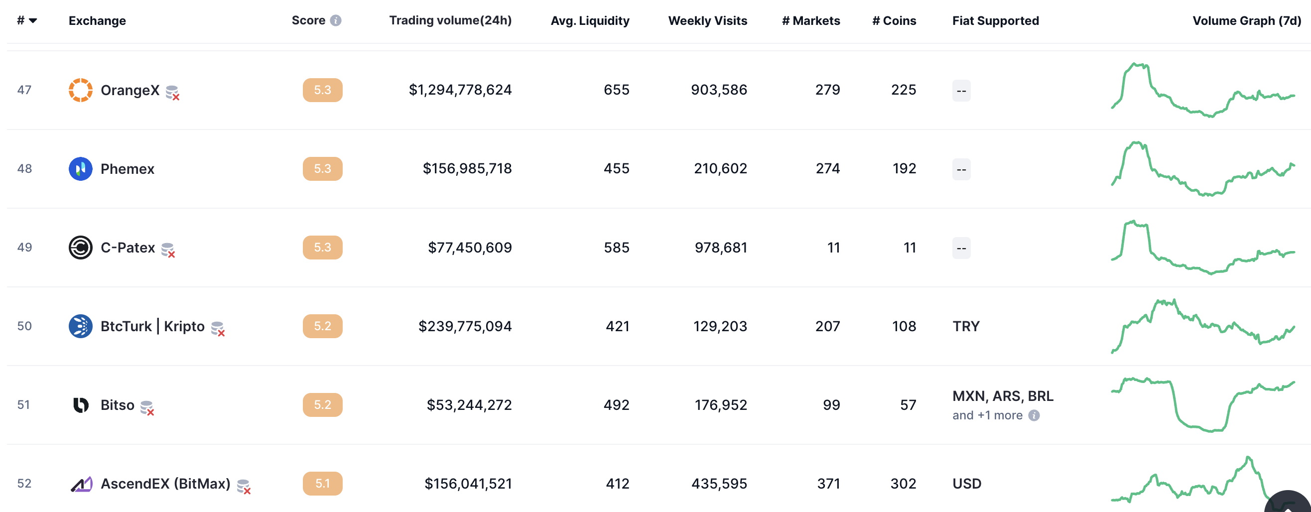 En la lista de exchanges de CoinMarketCap, Bitso está situado en el sitio 51 a nivel mundial, con un volumen de trading diario de más de 53 millones de dólares y más de 176 mil visitas semanales. Además, tiene listadas 57 criptomonedas y es uno de los pocos exchanges que no ha revelado los datos de sus reservas.