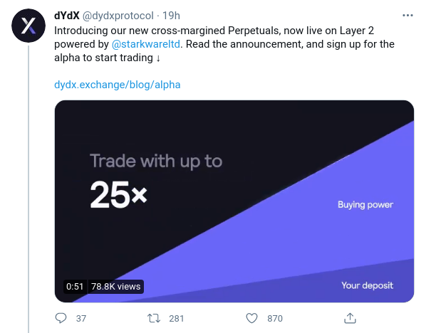 El exchange se ha asociado con StarkWare para aprovechar su motor de escalabilidad StarkEx y ejecutar contratos perpetuos dYdX. Añadió que los traders pueden hacer trading con tarifas de gas cero, tarifas de trading más bajas y, como resultado, cantidades más pequeñas de trading.