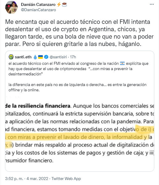 Sin embargo, el Fondo Monetario Internacional (FMI) sigue con su guerra contra las criptomonedas y al igual que con El Salvador intenta que Argentina no adopte las criptomonedas mediante diversas medidas o declaraciones.