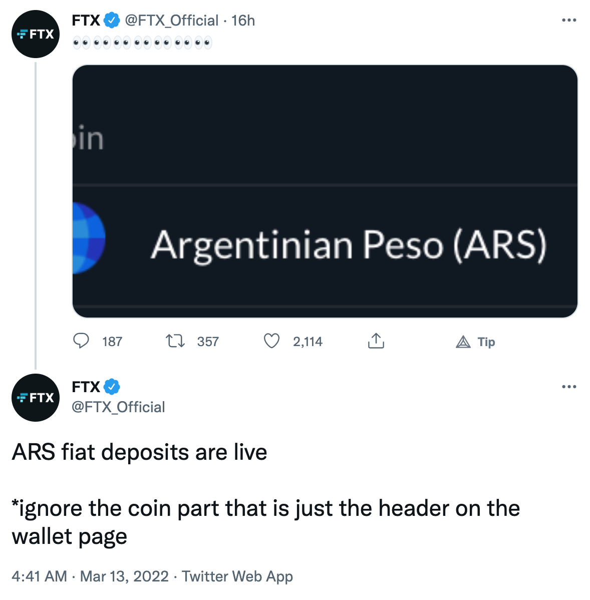 FTX clama que desde hace unas horas el depósito directo de pesos argentinos es posible y que dicho canal ya está abierto.