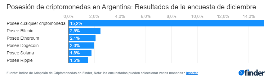 La encuesta realizada por Finder señala que aproximadamente el 15% de los argentinos poseen criptomonedas, lo que representa aproximadamente 4,9 millones de habitantes.