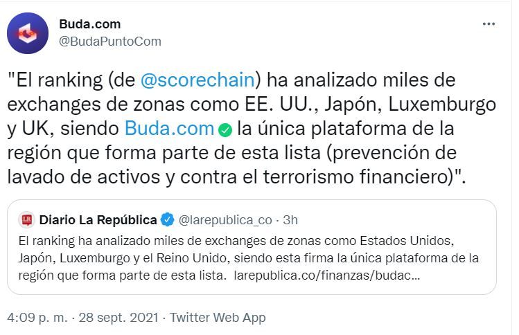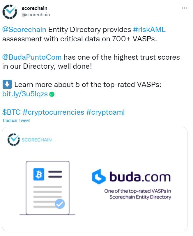 Para Scorechain, el exchange Buda cumple con las regulaciones ALD / CFT y ha implementado políticas y procesos excepcionales para mitigar los riesgos de lavado de dinero y financiamiento del terrorismo, y detalla que la plataforma ofrece servicios comerciales con BTC, ETH, LTC y más de forma segura para los usuarios.
