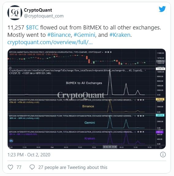 Según el proveedor de datos en cadena CryptoQuant, BitMEX ha experimentado retiros de más de 11,250 BTC, gran parte de las cuales se dirigieron a otros exchanges líderes, incluidos Binance, Gemini y Kraken.
