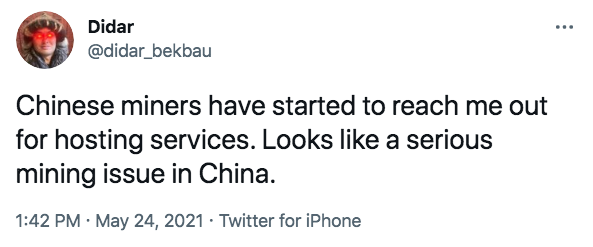 Edward Evenson, jefe de desarrollo comercial de Slushpool, ya a finales del mes de Mayo dijo en un hilo de Twitter que desde que se hicieron publicas las intenciones del gobierno chino de poner cerco tanto a la minería de Bitcoin como a las inversiones en la criptomoneda, ha recibido un volumen cada vez mayor de consultas de mineros chinos que tienen la intención de reubicar sus equipos, declarando: