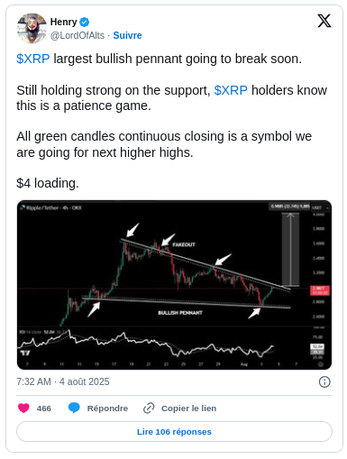 Técnicamente, XRP se mueve dentro de una figura en forma de banderín, la cual suele anticipar una ruptura al alza. Superar los niveles de 3.19 dólares y posteriormente 3.30 dólares confirmaría este escenario. Por el contrario, una caída prolongada por debajo de los 3 dólares anularía la proyección alcista.