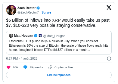Además, analistas como Zach Rector estiman que un flujo de 5 mil millones de dólares en futuros ETF de XRP podría impulsar el precio entre 7 y 10 dólares para octubre de 2025.