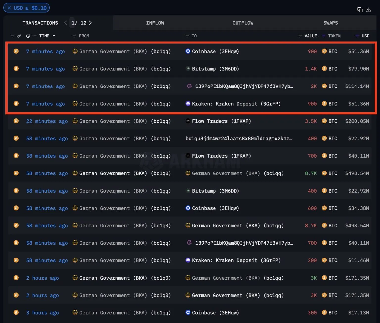 Unas horas después de la transacción inicial, el gobierno alemán envió 8,100 BTC adicionales, valorados en 463,2 millones de dólares, a exchanges y creadores de mercado, incluyendo 200 millones de dólares a Flow Traders. Poco después de esta segunda tanda, otros 5,200 BTC, o 297.3 millones de dólares, fueron enviados a Kraken, Bitstamp, Coinbase y 139Po.