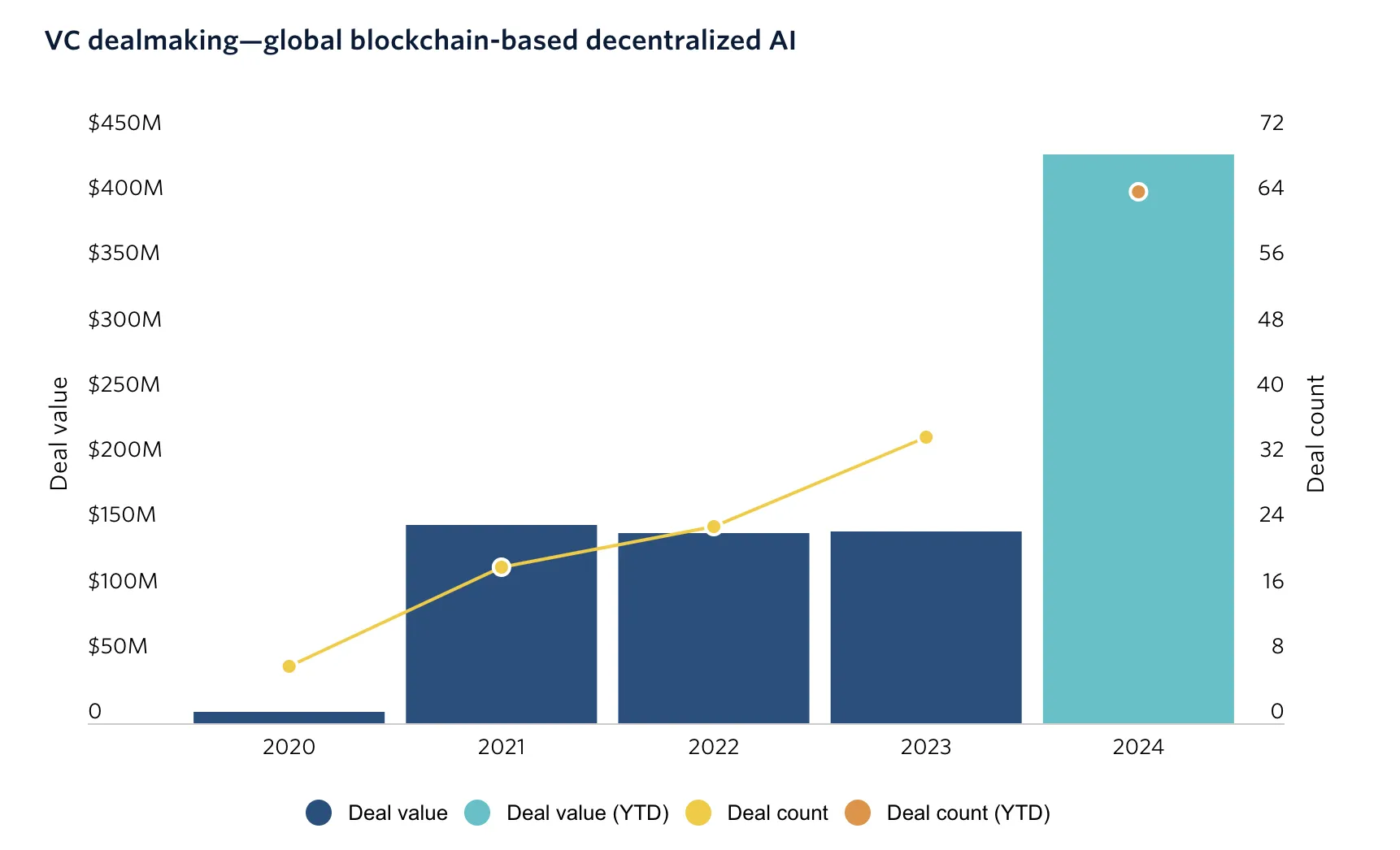 El sector de la IA descentralizada experimentó un crecimiento sin precedentes en 2024. Según PitchBook, los inversores invirtieron 436 millones de dólares en el campo, marcando un aumento de casi 200% en comparación con 2023.