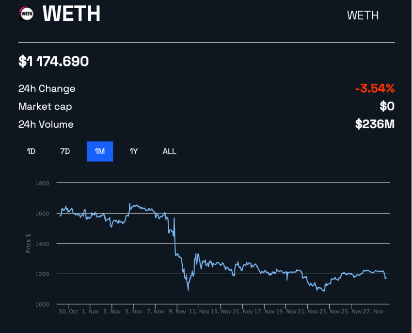 En términos de valoración, WETH actualmente cotiza en 1,174.69 dólares en una proporción de 0.999:1 a ETH después de presenciar una caída de 3.71% en las últimas 24 horas.