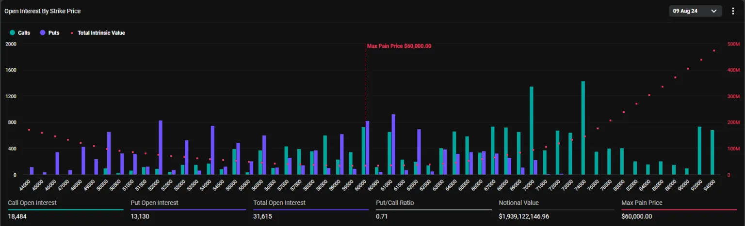 Según Deribit, 1,94 mil millones de dólares en opciones de Bitcoin están por expirar. El punto de máximo dolor de estos contratos está en 60,000 dólares. Estas opciones incluyen 31,615 contratos, ligeramente menos que los 36,732 de la semana pasada. La relación put-to-call de 0.71 indica un sentimiento general alcista a pesar de la reciente volatilidad.