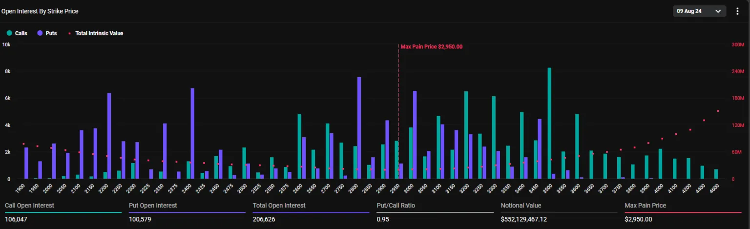 Ethereum tiene 552.13 millones de dólares en opciones que expiran, involucrando 206,626 contratos. Esta cifra es un aumento respecto a los 183,756 contratos de la semana anterior. El punto de máximo dolor para estas opciones es 2,950 dólares, y la relación put-to-call es 0.95.