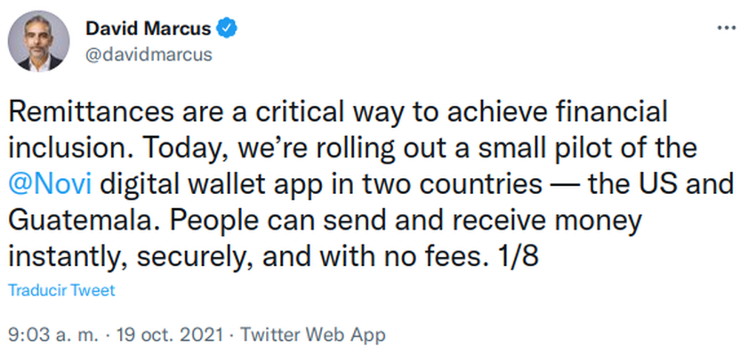 Sponsored“Las remesas son una forma fundamental de lograr la inclusión financiera. Hoy, estamos lanzando una pequeña prueba piloto de la app de monedero digital @Novi en dos países: EE. UU. y Guatemala. Las personas pueden enviar y recibir dinero al instante, de forma segura y sin comisiones”.