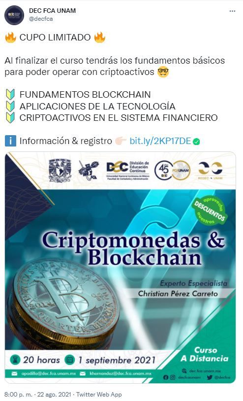 La División de Educación Continua (DEC) de la Facultad de Contaduría y Administración de la Universidad Nacional Autónoma de México (UNAM) anunció su curso virtual “Criptomonedas & Blockchain”, a realizarse el próximo 1 de septiembre, y durará 20 horas.
