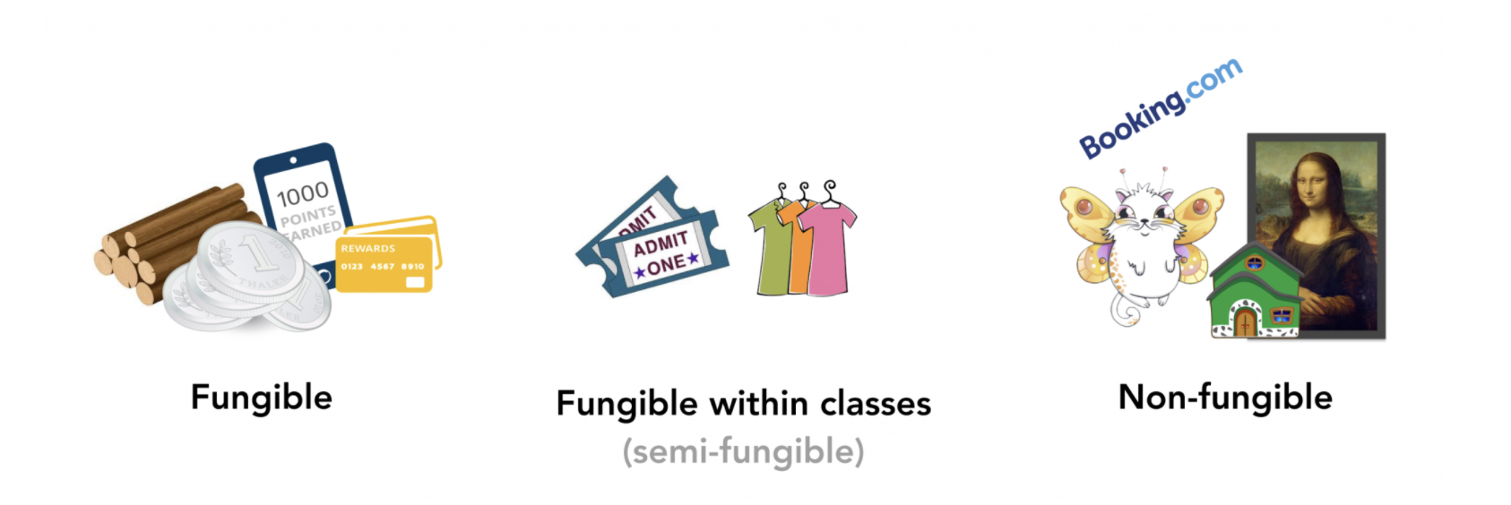 Por ejemplo, imaginemos una entrada para el teatro que esté numerada. Si uno tiene una entrada para la primera fila y otro en la última, intercambiar esas entradas daría como resultado que uno de los usuarios perderá valor y otro lo ganará. No pasa lo mismo por ejemplo con una moneda de un euro. Si dos personas intercambian una moneda de 1 euro entre sí, ambos continuarán teniendo el mismo poder de compra.
