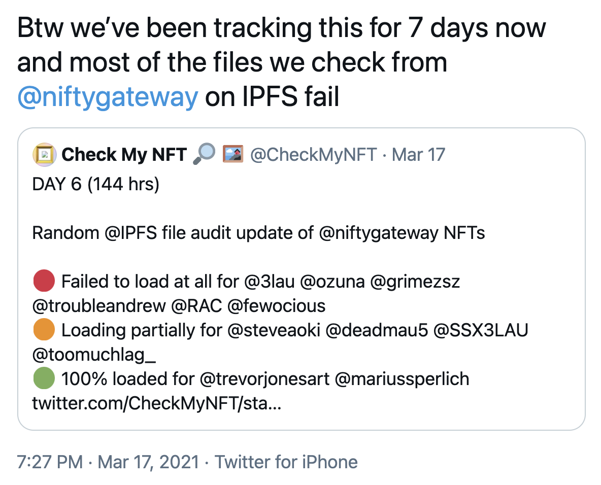 “Check my NFT” es una plataforma que se encarga de medir la seguridad y la fiabilidad de los archivos de metadatos que contienen los NFTs. Según algunos de sus hallazgos la mayoría de los archivos que han verificado de la plataforma Nifty Gateway en IPFS fallan.